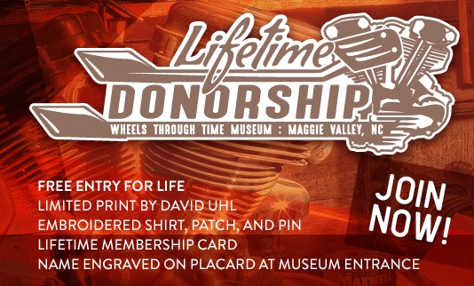 In 2016, The Wheels Through Time Museum introduced The Lifetime Donorship program to help sustain the growth of the museum and the ongoing effort to educate our visitors on the history of American Motorcycles. Along with free lifetime admission for yourself and three guests of your choice, you also receive a limited David Uhl painting of The Discovery , an Embroidered Wheels Through Time Button-up shirt with your name on it, two dozen raffle tickets for the 2017 raffle bike, and more. As a Lifetime Donor, we welcome you to The Wheels Through Time family and invite you to come in for a visit whenever our doors are open!