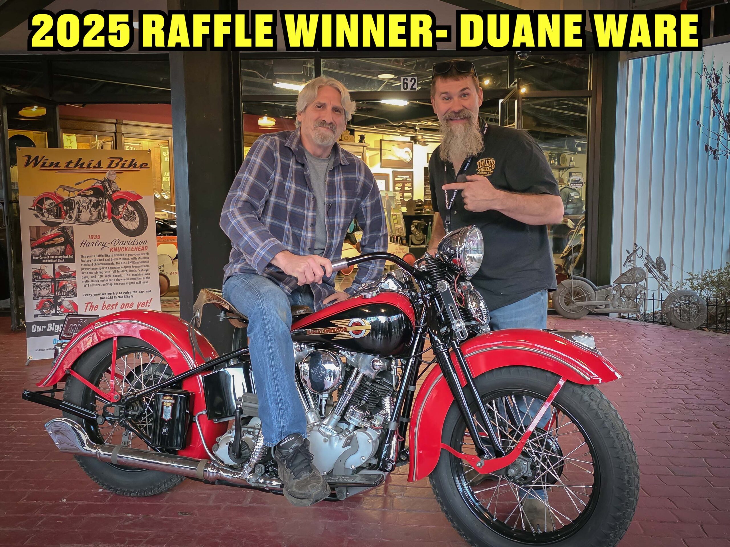 Dale’s Wheels Through Time, the premier all-American motorcycle museum in Maggie Valley, NC, held its twenty-third annual raffle on November 22nd. From its opening in 2002, the museum has restored and then given away a classic American motorcycle. This year, the grand prize was a 1939 Harley-Davidson Knucklehead, finished in Teak Red and Brilliant Black HD Factory colors.